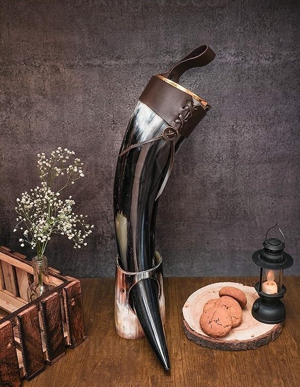 Channel your inner warrior with this authentic Drinking Horn Mug, handcrafted from ethically sourced horn and polished to a smooth, food-safe finish. Ideal for sipping beer, wine, or mead, it comes complete with a metal or wooden stand for display and a genuine leather strap for easy carrying — perfect for Viking feasts, medieval events, or rustic home bars.