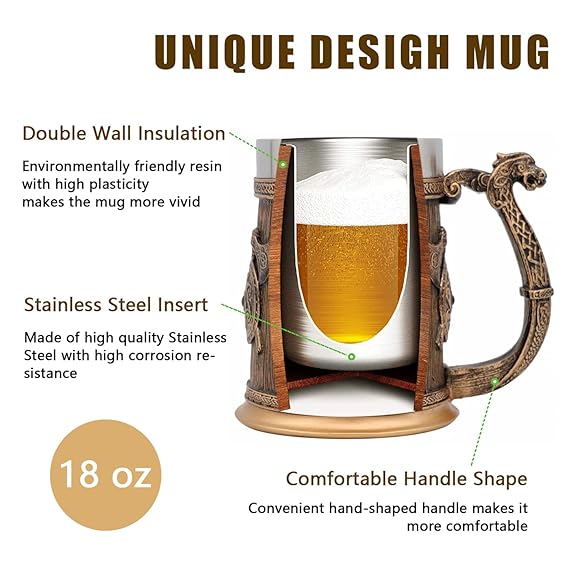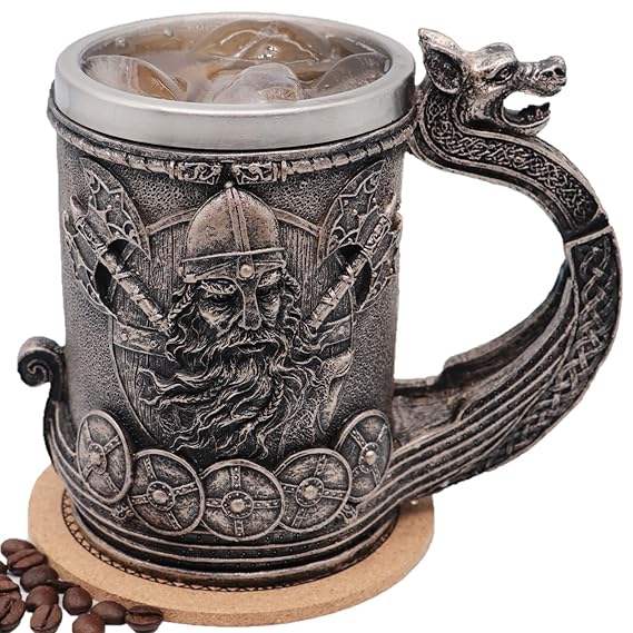 ?STURDY&SAFELY?:The inner mug is made of food grade 304 stainless steel,The outer part of the mug is made of high quality resin.Our unique design beer mug is food grade,non-toxic,safe, durable and hygienic. ?Nice Gift?: This beer mug can be used as a novel gift to give customers,relatives,friends,and wives to their husbands,and their children to give their parents a wonderful gift.It will be a unique present for Father's Day,Valentine's Day,Christmas,Hannukah, Birthdays,June Birthstone. ?UNIQUE DESIGN?:Creative design with Viking Dragon Ship Drakkar Warrior,perfect medieval gift and skull collection,the best gift for friends and family, this stainless steel mug is the perfect choice for Halloween and other festivals. ?Lager Capacity?: The mug is 5.2" tall,6.7" long and 3.7" in diameter with 18 ounces.It can be used as a unique medieval mug,stylish renaissance beer barrel mug,decor mug of gothic norse mythology style,grooms or groomsmen gift mugs,tankard or stein for beer,coffee,tea or other cold and hot drinks.We desire to create fun & awesome mugs for everyone who love the life! ?Care Instructions?:Do not store this mug near the heating devices or leave them in the sun,the resin dries up and later cracks may appear.Best place for keeping resin goods is in the locker or any other dry place.Do not leave resin items in a container with water for a long time.Wipe them dry with a towel after each time you wash them.Drying in any drying equipment is contraindicated and leads to deformation and cracking.Do not microwave,carefully use in the freezer.