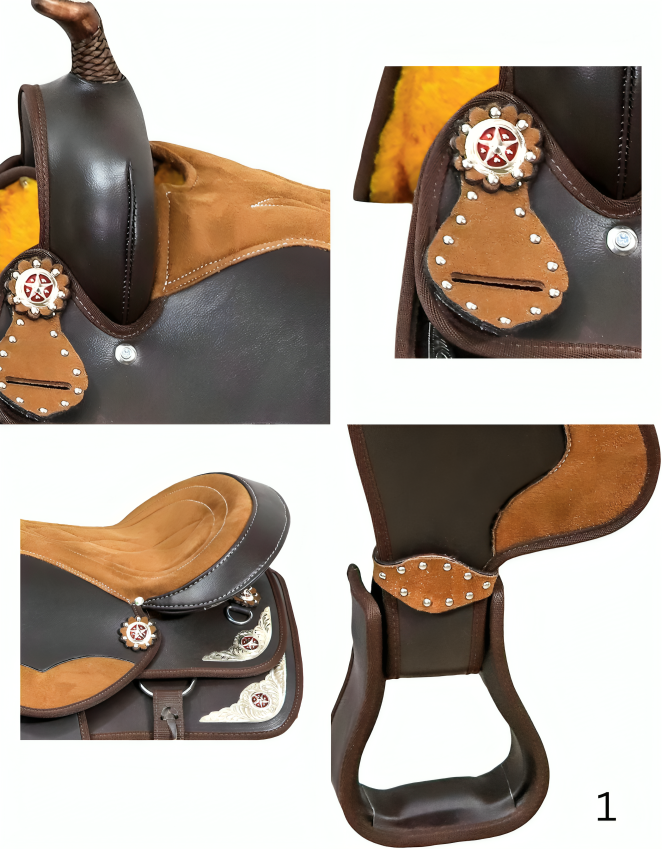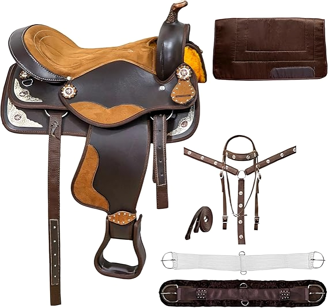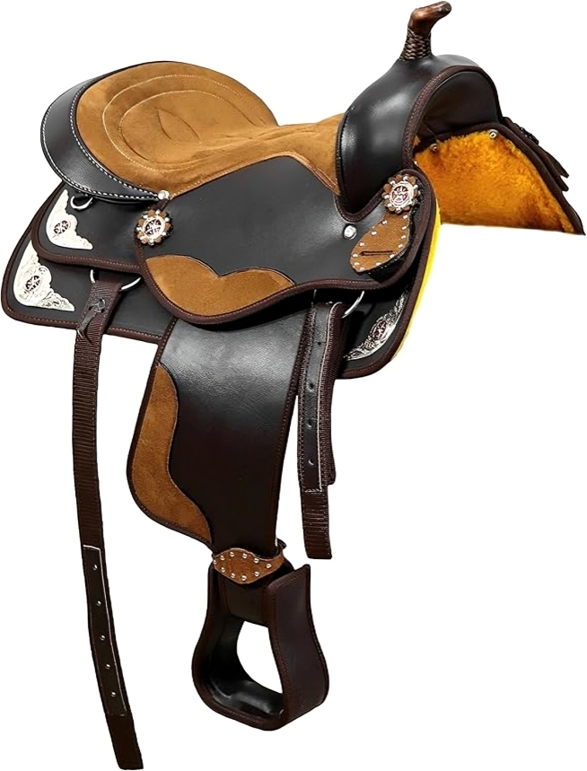 Adult Classic Quality Handmade Synthetic Premium Comfort Western Barrel Racing Trail Equestrian Horse Saddle Tack Size 15" to 17" Seat Available Size : 15" to 17" inches all sizes are available. Included in Package: Headstall, Breast Collar & Reins. Soft Synthetic Fleece : Soft Synthetic Fleece Lining has been used to provide extra comfort to the horse. So both rider and horse feel a new level of comfortability. Horn: Equipped with a sturdy horn on the front to provide a secure grip and aid in tight turns and quick maneuvers. Lightweight design: Synthetic barrel saddles are typically made from lightweight materials such as synthetic leather or Cordura, making them easier to handle and maneuver during barrel racing events.